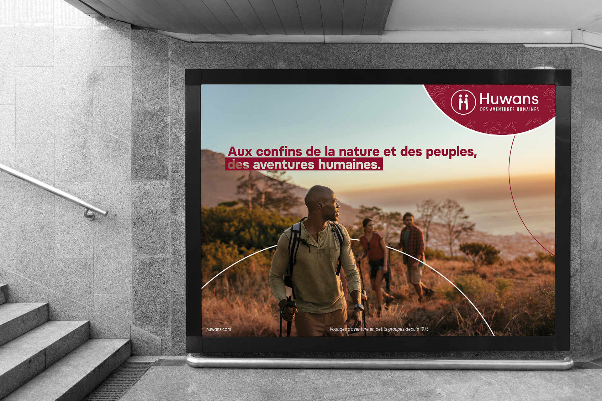 FR : Huwans est une agence de voyage axée sur l'aventure, offrant des expériences uniques et responsables pour les voyageurs désireux d'explorer des destinations hors des sentiers battus. De la randonnée à la découverte culturelle, Huwans propose des voyages enrichissants pour les passionnés d'aventure. J'ai eu le privilège de collaborer avec Huwans dans la création de leur campagne publicitaire, affichée sur plus de 50 panneaux d'affichage dans le métro parisien, ainsi que dans la conception d'une vidéo DOOH (Digital Out-of-Home) diffusée pendant plusieurs semaines aux gares de Lyon et Saint-Lazare.